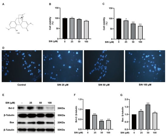 Effect of SIN on BPH-1 cell apoptosis. (A) Chemical structure of SIN. (B) Effects of SIN on RWPE-1 cell viability. (C) Effects of SIN on BPH-1 cell viability. (D) Representative images of DAPI-stained cells were observed under a fluorescence microscope. (E) Effects of SIN on the expression of apoptosis-related proteins. Protein quantification for (F) Bcl-2, (G) Bax versus β-tubulin. Data are the mean ± SEM. Statistics: * p < 0.05, ** p < 0.01, *** p < 0.001 versus the control group. SIN, sinomenine hydrochloride; Bcl-2, B-cell lymphoma-2; Bax, BCL2-associated X protein.