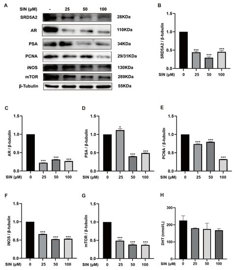 To investigate the role of SIN in the androgen signaling of BPH, protein expression of SRD5A2, AR, and PSA in BPH-1 cells was measured via western blotting and in cell supernatants by ELISAs. Overexpression of SRD5A2 (p < 0.001) (Figure 2B), AR (p < 0.001) (Figure 2C), and PSA (p < 0.001) (Figure 2D) in BPH-1 cells was downregulated by SIN treatment (Figure 2A). SIN therapy induced a reduction in the DHT concentration measured in the supernatants of BPH-1 cells, though the difference was not significant (p > 0.05) (Figure 2H). High protein expression of PCNA (p < 0.001) (Figure 2E), iNOS (p < 0.001) (Figure 2F), and mTOR (p < 0.001) (Figure 2G) was inhibited significantly by SIN treatment.