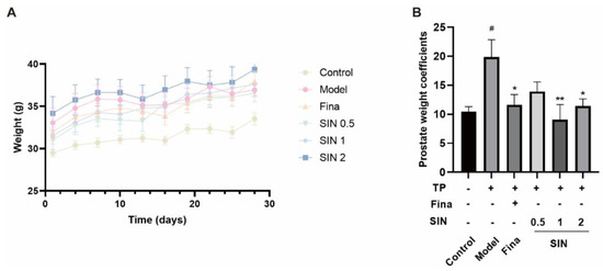 To confirm the anti-BPH effect of SIN treatment in vivo, a mouse model of BPH was established by administering finasteride or SIN (0.5, 1, 2 mg/kg) concomitant with TP injection for 4 weeks. Bodyweight was measured every 3 days to determine the effects of TP and finasteride/SIN treatments (Figure 3A). Mice organs were weighed to ascertain the effects of SIN treatment on TP-induced BPH in mice. The PG weight coefficient (i.e., wet weight of PG (mg)/bodyweight of mice (g) × 10) in mice of the model group was significantly higher than that of the control group (19.87 vs. 10.43 mg/10 g, p < 0.05) (Figure 3B). The finasteride group had a significantly lower PG weight coefficient compared with that of the model group (11.63 mg/10 g, p < 0.05) (Figure 3B). Compared with the model group, the PG weight coefficient of SIN groups (0.5, 1, 2 mg/kg) was reduced to 13.92, 9.05, and 11.41 mg/10 g, respectively (Figure 3B).