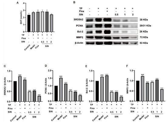 As shown in Figure 4A, the DHT in the serum of the model group was higher than that of the control group (2.71 vs. 2.37 nmol/L, p > 0.05). Interestingly, the high dose of SIN (2 mg/kg) decreased the content of DHT (p > 0.05). The overexpression of SRD5A2 (p < 0.001) (Figure 4C), PCNA (p < 0.001) (Figure 4D), Bcl-2 (p < 0.001) (Figure 4E), and MMP2 (p < 0.001) (Figure 4F) in the PG tissue of mice with TP-induced BPH was downregulated by treatment with finasteride or SIN. Moreover, the effects of SIN on protein expression of PCNA and Bcl-2 were dose-dependent.