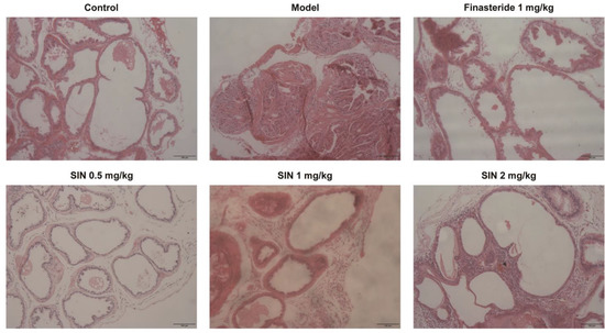 Histological alterations in the PG tissue of mice with TP-induced BPH were examined via H&E staining. Compared with the control group, the number of layers of glandular epithelial cells, volume, folds in the acinar structure, area of the glandular lumen, epithelial-cell proliferation, and infiltration of some inflammatory cells were increased significantly in the model group. Cells were restored to a morphology similar to that of the control group following the administration of finasteride or SIN (0.5, 1, 2 mg/kg) (Figure 5).