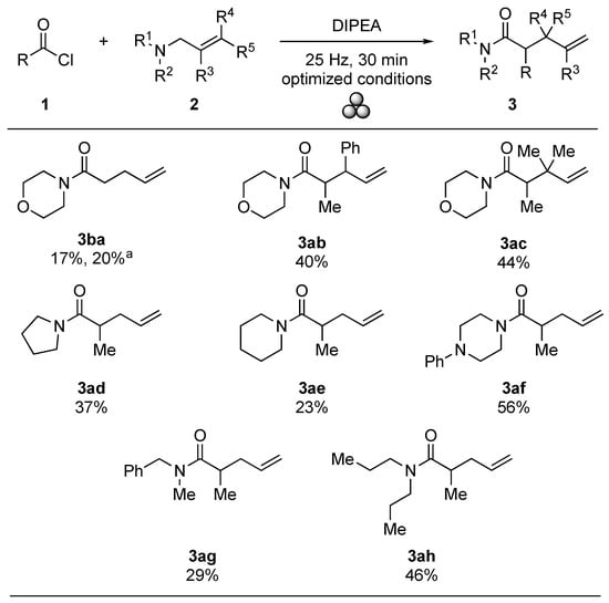 With the optimized conditions in hand, we investigated the limitations of the developed mechanochemical charge-accelerated aza-Claisen rearrangement protocol (Scheme 1). First, the acyl chloride 1 was varied. When propionyl chloride was substituted by acetyl chloride the corresponding amide 3ba was obtained in a low yield of 17%. The use of acetyl bromide increased the yield of 3ba slightly to 20%. The reduced yield might be attributed to the even more volatile ethenone, but this result also showed the possible use of acyl bromides as potential ketene precursors. In general, the use of other acyl chlorides proved difficult under the applied conditions (Supplementary Material, Scheme S1). Most likely, the combination of Hünig’s base and acyl halides 1 other than propionyl chloride (1a) is not suitable for the desired dehydrohalogenation.