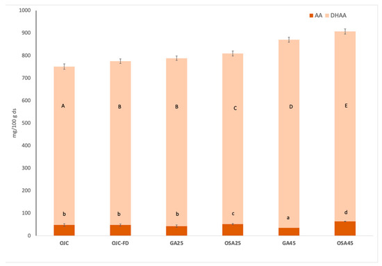 Vitamin C (sum of ascorbic acid (AA) and dehydroascorbic acid (DHAA)) of the orange juice co-product before (OJC) and after freeze-drying (OJC-FD), and those freeze-dried orange co-products formulated with gum Arabic and starch modified with octenyl succinic anhydride, at 25 and 45 g/100 g co-product dry solutes (GA25, GA45, OSA25, OSA45, respectively). Results are expressed as mg of bioactive/100 g of orange coproduct dry solutes (ds). Different letters indicate different homogeneous groups established by Tukey HSD ANOVA (p < 0.05) between samples: a–d for AA and A–E for DHAA.