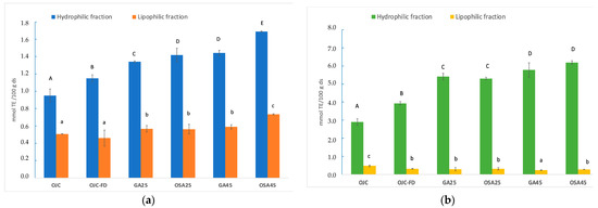 Antioxidant capacity measured by DPPH (a) and FRAP (b) of the hydrophilic and lipophilic fractions of orange co-product before (OJC) and after freeze-drying (OJC-FD), and those freeze-dried orange co-product samples formulated with gum Arabic and starch modified with octenyl succinic anhydride, at 25 and 45 g/100 g co-product dry solutes (GA25, GA45, OSA25, OSA45, respectively). Results are expressed as mmol Trolox Equivalent (TE)/100 g of orange coproduct dry solutes (ds). For each fraction, different letters indicate different homogeneous groups established by Tukey HSD ANOVA (p < 0.05) between samples: A–E for the hydrophilic fraction; a–c for the lipophilic fraction.
