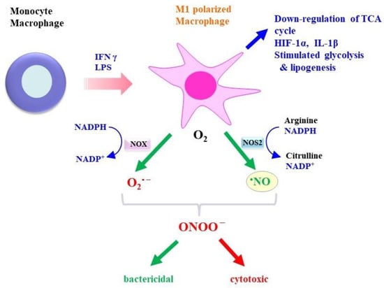 NADPH oxidase (NOX), notably NOX2, is also activated in M1 macrophages and produces superoxide (O2•−) that is then converted to other reactive oxygen species (ROS) []. •NO reacts with ROS to form reactive nitrogen oxide species (RNOS). Peroxynitrite (ONOO–), which is formed from •NO and O2•−, is a powerful oxidant and may be responsible for oxidative damage to surrounding tissues []. While •NO exerts potentially beneficial effects, accidentally produced RNOS may exhibit deleterious effects, which leads to a controversial assessment of the roles of NOS2 in vivo. Therefore, it would be wise to consider the primary actions of •NO separately from those of secondarily produced RNOS [].