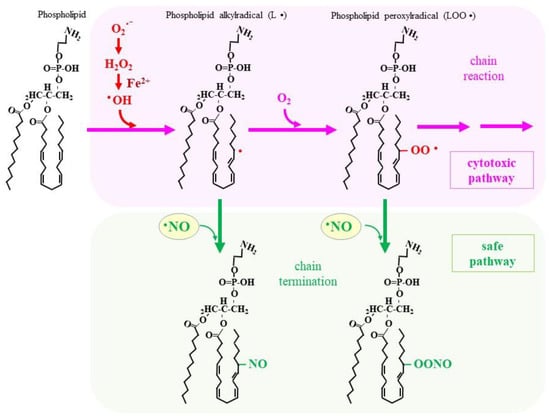 •NO also exhibits a high reactivity for lipid radicals (L• and LOO•). The reaction of •NO with such radicals is in fact quite rapid, with rate constants of 1–3 × 109 M−1s−1 [], which results in the formation of LNO and LOONO [] (Figure 3). The resulting nitroso lipids are much less toxic compared to lipid radicals, so that these reactions alleviate oxidative damage caused by lipid radicals. For example, in liposome systems, the formation of phosphatidylcholine and cholesterol peroxides is actually suppressed by •NO [,]. Several •NO donors have been reported to inhibit the macrophage-dependent oxidation of low density lipoprotein (LDL) in cultured cells []. While NOS2-deficient macrophages show enhanced oxidation in LDL [], the pretreatment of oxidized LDL with •NO decreases apoptosis-inducing ability with suppressed lipid peroxyl radical formation [].