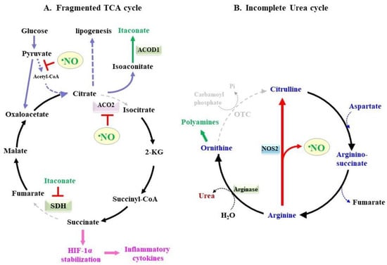 Metabolic remodeling of TCA cycle and urea cycle. (A) The TCA cycle in M1 macrophages is fragmented in the reaction catalyzed by ACO2, which leads to the flow of carbon to lipogenesis and the production of itaconate by means of ACOD1. ROS and RNOS are involved in the suppression of ACO2. The resulting itaconate inhibits SDH, which leads to the activation of HIF-1α and the subsequent induction of genes for inflammatory cytokines and glycolysis. (B) •NO is produced from arginine by NOS2 and results in citrulline. Since macrophages do not express OTC, ornithine is not utilized for citrulline synthesis, but is recruited for the synthesis of polyamines.