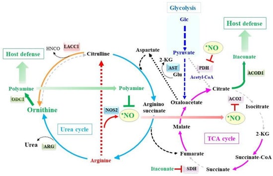 The TCA cycle and urea cycle are remodeled in M1 macrophages under conditions of inflammation. There is crosstalk between these metabolic pathways. Itaconate and polyamines that are produced from the remodeled TCA cycle and urea cycle, respectively, function to autoregulate M1 macrophage functions and host defenses against microbial infections. Further clarification of this type of metabolic remodeling would lead to a better understanding of the overall function of M1 macrophages and controlling them in cases of inflammatory diseases. Although induction of NOS2 occurs in some other cells, its relationship with metabolic systems, which has been revealed in M1 macrophages, remains largely unknown. Further elucidation of the role of NOS2-derived •NO in relation to other metabolic systems in a wide range of cells will lead to a comprehensive understanding of redox systems in vivo.