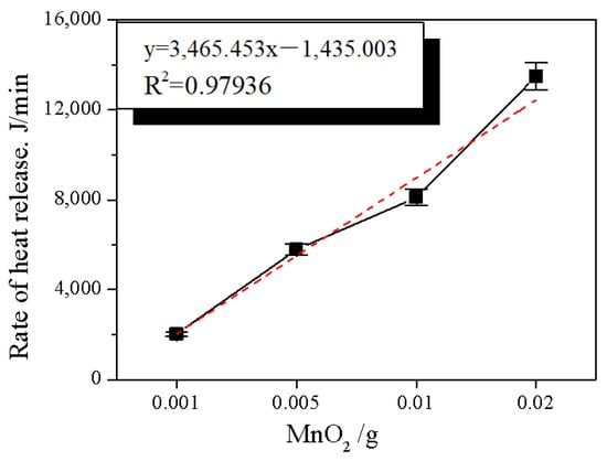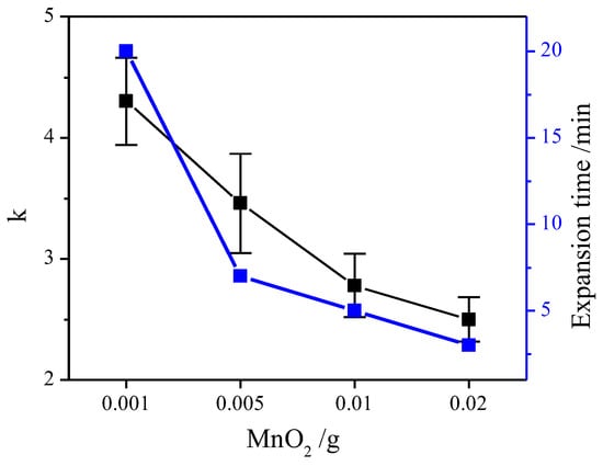 In this experiment, the effect of manganese dioxide on the expansion time and expansion rate k was investigated just as shown in Figure 1. The result shows that the expansion time was significantly reduced with the increase in manganese dioxide. When the addition amount was 0.001 g, the reaction ended in about 20 min. When the addition amount was 0.02, the reaction ended in about 3 min. Meanwhile, the trend of k was the same as the expansion time. At the addition amount of 0.001 g, k ≈ 4.2. It was the largest. More than 50% increased over 0.02 g. It may be caused by the different amount of manganese dioxide addition. This result was further analyzed. The different addition amounts resulted in the change of exothermic rate. It was shown that when H2O2 decomposed at a concentration of 30%, the heat released was 670~714 J/g []. Since the 30% hydrogen peroxide used in each group was 40 mL, the total heat released by hydrogen peroxide was calculated to be 39,208.4~41,783.28 J. The relationship between the amount of manganese dioxide and the exothermic rate was then fitted linearly (Figure 2). The relationship was found to fit the univariate regression equation, R2 = 0.97567. The fit was good. The exothermic rate of 0.02 was more than 5 times that of 0.001. Therefore, it can be inferred that the addition of manganese dioxide was directly proportional to the exothermic rate of hydrogen peroxide. Meanwhile, the slower the exothermic rate, the higher the vermiculite expansion rate.