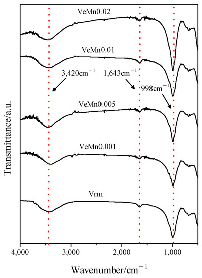 Then the morphology was analyzed. The results of XRD and Fourier transform infrared (FTIR) tests are shown in Figure 3 and Figure 4. It can be seen that, the addition of manganese dioxide did not have a significant effect on the vermiculite crystal structure. The number of Vrm layers, hydrargyrite layers, and water molecule layers of the samples remained 2, 1 and 0 []. By reviewing the literature, 998 cm−1 is the Si-O-Si stretching vibrational band and 3420 cm−1 and 1643 cm−1 are the vibrational absorption bands of the water molecules []. Manganese dioxide did not cause any change in the structure of the functional groups. It was verified that peroxide expanded vermiculite did not cause structural damage. This is of great importance for the treatment of pollutants in the environment [,,].