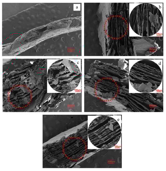 To visualize the effect of manganese dioxide on the expansion, SEM tests were performed, as shown in Figure 5. Figure 5b–e shows the microstructure of the samples with different manganese dioxide. At 0.001 g, the Vrm layer was the thinnest and the average layer spacing was the largest. With the increase in MnO2, the interlayer spacing of Vrm gradually decreased. The thickness of the layer also increased. The Vrm layers were not exfoliated at 0.02 because too fast an exothermic rate cannot reach expansion. It is consistent with the results in Figure 1. That is, the expansion rate was the largest at 0.001 g of MnO2. It is calculated that the exothermic rate at this time was 1960.42~2089.164 J/min. At this rate, the expansion effect is the best. It can effectively increase the volume of Vrm and affect the specific surface area, which is favorable for the adsorption of pollutants []. Therefore, 0.001 g will be selected for the follow-up study.