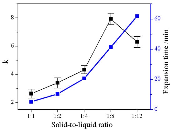 After the amount of manganese dioxide was determined, the ratio of vermiculite to hydrogen peroxide was also discussed. A suitable solid–liquid ratio can effectively reduce the waste of resources. Five different solid–liquid ratio conditions were designed. Figure 6 shows the variation of expansion time and k. Among all samples, the best performance was 1:8. Compared to 1:1, k was increased by about 3 times, k≈8. The expansion time was about 40 min. Marcos [] found that vermiculite immersed in 30% hydrogen peroxide had a k of about 6 after 4 h. The expansion efficiency and k were significantly lower than VeH8. Combined with Figure 6, it can be seen that the variation of k can be divided into two periods. At the solid–liquid ratio greater than 1:8 (w/v), k tended to increase. When it is smaller than 1:8 (w/v), k fell back. The expansion time showed an increasing trend. It showed that the trend of expansion time and k was related to hydrogen peroxide, but k decreased after exceeding a certain amount. The amount of hydrogen peroxide determined the total heat release of the reaction. When the Vrm was 10 g, the total heat release of the five groups increased from 10,445.82 J to 125,349.84 J sequentially. At the same time, they had the same exothermic rate. Combined with the trend of k (Figure 6), it can be speculated that when the total amount of exotherm was too high, it was unfavorable for the expansion. To find out the effect of hydrogen peroxide on expansion, SEM, N2 adsorption–desorption tests will be performed on the samples later.
