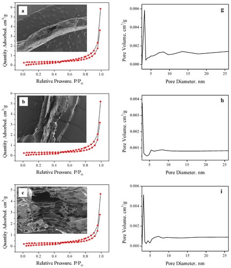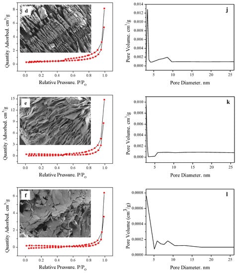 The SEM, N2 adsorption–desorption and pore diameter distribution results are shown in Figure 7 (N2 adsorption–desorption test was performed on the samples under 77 k liquid nitrogen conditions. The degassing conditions were 300 °C, 6 h). First, according to the pore diameter distribution curves, the pore size of all samples was mainly distributed around 3 nm, and no obvious trend was observed. Then the N2 adsorption–desorption curves were analyzed; it can be seen that all five groups have type V adsorption isotherm curves. At lower P/P0, the adsorbent material–adsorbent gas interactions were relatively weak. At higher relative pressures, an inflection point appeared, which indicates that the agglomerated molecules filled the pore channels. The hysteresis line in the high-pressure region was almost vertical and the adsorption–desorption curves are almost parallel there, which indicates that the pore size distribution of the sample was concentrated. The adsorption curves do not show the ultimate adsorption capacity in the high-pressure region, and the adsorption capacity increases monotonically with increasing pressure, indicating the presence of parallel plate or conical slit pores inside the sample []. The specific surface area of the sample was calculated to be in the range from 4 to 40 m2/g, with an increasing trend. However, it was still maximum at 1:8 and dropped back at 1:12. The highest N2 adsorption–desorption values were found in Figure 7e. It proves that N2 adsorption was maximum at 1:8. It coincided with the specific surface area results. Combined with the scan, the morphological changes were clearly seen. With the increase in hydrogen peroxide, the expansion effect became more and more obvious. In 1:8 (w/v) condition, the Vrm layer spacing was significantly larger than the other cases. The interlayer structure was propped open obviously, the sheet layer was smooth and complete, and the thickness was significantly smaller than the other samples. This may be the cause of the greatest amount of adsorption. However, at 1:12 (w/v) condition, the vermiculite lost its accordion-like interlayer structure and became disordered. Although more complete lamellae were seen, they adhered to each other and the pores were blocked. This may be the reason for the decrease in K value. It also explains why the N2 adsorption–desorption at 1:12 was less than 1:8 (w/v). With this conclusion, it can be seen that both the exothermic rate and the total exothermic heat have an effect on the expansion.