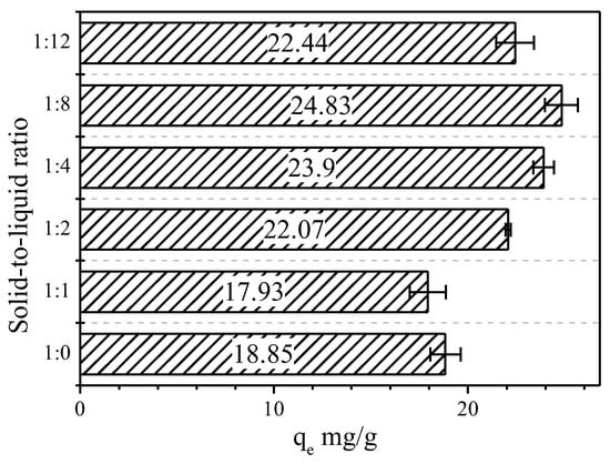 By exploring the optimal solid–liquid ratio, it was initially determined that the expanded Vrm obtained under the condition of solid–liquid ratio of 1:8 (w/v) when the amount of manganese dioxide was 0.001 g had a better expansion effect. Based on this conclusion, it was boldly assumed that the adsorption rate of VeH8 to pollutants in the environment was the largest among the five groups of samples under the same conditions. To confirm this hypothesis, a set of adsorption experiments will be designed.