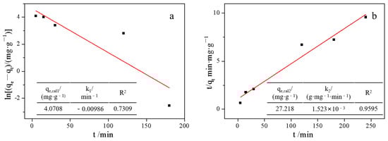 To investigate the mechanism of adsorption and possible rate control steps, kinetic models were used to fit experimental data. The pseudo-first order kinetics and pseudo-second order kinetics models were fitted, respectively. The expressions for the two different kinetic models are as follows (Equations (1) and (2)), where qe, qt, k1, t, and k2 represent the equilibrium adsorption amount, the adsorption amount of the sample at different times, the rate constant of the pseudo-first-order kinetic model, the adsorption time, and the rate constant of the pseudo-second-order kinetic model, respectively.