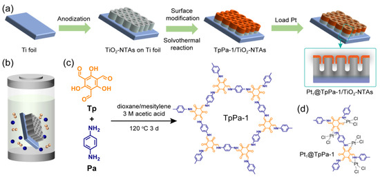 The TpPa-1 films were constructed on the surface of TiO2 NTAs by using a solvothermal method, as shown in Figure 1. A precursor solution was prepared by suspending 1,3,5-triformylphloroglucinol (Tp, Innochem, 97%, 0.2 mM~2 mM) and p-phenylenediamine (Pa, Innochem, 97%, 0.3 mM~3 mM) in a vial containing 3 mL mesitylene, 3 mL dioxane, and 1 mL acetic acid solution (3 M, Acros Organics, >98%). The precursor solution was homogeneously mixed by ultrasonic treatment for 15 min and then transferred into a 25 mL Teflon autoclave container. A homemade scaffold was used to horizontally hold the TiO2-NTAs/Ti plate in the reacting solution, facing the bottom. The autoclave was sealed and heated at 120 °C for 72 h, growing TpPa-1 films on the TiO2 NTAs surface. The obtained TpPa-1/TiO2-NTAs/Ti plate was rinsed with tetrahydrofuran (THF), activated in THF for 24 h, and finally dried at 70 °C overnight under vacuum conditions. Pt loading was performed by dipping the TpPa-1/TiO2-NTAs/Ti plate in an H2PtCl6 (Sigma-Aldrich, ≥99.9%) aqueous solution (1 mg mL−1, 0.5 mL, 1 mL, 2 mL, and 4 mL) for 30 min under the irradiation of an Xe lamp (AM 1.5 simulated sunlight, 300 W, 100 mW cm−2) according to the previously reported in situ photo-deposition method [20]. The Pt1@TpPa-1/TiO2-NTAs/Ti plate was washed with deionized water and dried at 70 °C for further characterization and measurements.
