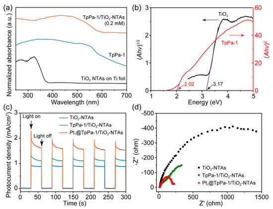 (a) UV–vis absorption spectra of TpPa-1/TiO2-NTAs, TpPa-1 powders, and TiO2 NTAs on Ti foils. (b) Tauc’s plots for TiO2 and TpPa-1 based on the absorption spectra. (c) Transient photocurrent response of TiO2 NTAs, TpPa-1/TiO2-NTAs, and Pt1@TpPa-1/TiO2-NTAs with or without light irradiation. (d) EIS Nyquist plots of TiO2, TpPa-1/TiO2-NTAs, and Pt1@TpPa-1/TiO2-NTAs under light irradiation. The TpPa-1 COF films were obtained from 0.2 mM Tp and 0.3 mM Pa for the above characterization.