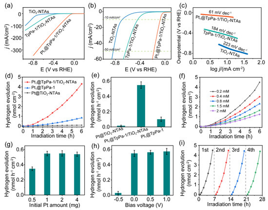 (a,b) Linear scan voltammetry curves and (c) Tafel plots of TiO2 NTAs, TpPa-1/TiO2-NTAs, and Pt1@TpPa-1/TiO2-NTAs under light irradiation. (d,e) Hydrogen evolution performance of Pt1@TpPa-1/TiO2-NTAs compared to Pt@TiO2 NTAs and Pt1@TpPa-1. Effect of (f) monomer concentration (based on Tp), (g) initial Pt amount, and (h) applied bias voltage (vs. SCE) on the hydrogen generation performance of Pt1@TpPa-1/TiO2-NTAs photoelectrode. (i) Cycle tests of hydrogen evolution.
