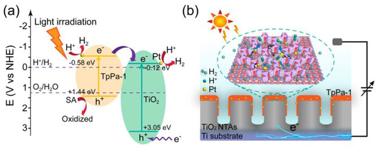 To further understand the PEC hydrogen evolution process, the charge transfer in the TpPa-1/TiO2-NTAs heterostructures and interfacial reaction is illustrated combined with the PEC performance of Pt1@TpPa-1/TiO2-NTAs photoelectrode. The flat-band potentials of TiO2 NTAs and TpPa-1 are evaluated as −0.46 V and −0.92 V (vs. SCE), respectively, based on the Mott–Schottky curves (Figure S18). The band diagrams of TpPa-1/TiO2-NTAs heterostructures are demonstrated in Figure 5a, with their optical band gaps. The lowest unoccupied molecular orbital (LUMO) of TpPa-1 and conduct band of TiO2 NTAs are evaluated as −0.58 eV and −0.12 eV, respectively, which are available to generate hydrogen from water. Both TpPa-1 and TiO2 NTAs can be excited under full-range light irradiation. These band structures benefit the effective charge separation between TpPa-1/TiO2-NTAs heterostructures. The excited electrons in TpPa-1 can further transfer to TiO2 NTAs. The separated electrons further reduce protons to produce hydrogen with the Pt1 co-catalysts. Because of the difficulty in oxidizing water, a sacrificial electron donor (SA is used here) is usually added to PEC hydrogen production systems to regenerate the photosensitizer. The photogenerated holes in the TpPa-1 films and TiO2-NTAs can be captured by the sacrificial SA and electrons from the Ti substrate electrode. Ultrathin TpPa-1 films with regular pore size on TiO2-NTAs and the hydrophilicity of Pt1@TpPa-1/TiO2-NTAs photoelectrode are conducive to the penetration of protons, water, and ions to the reactive sites of the heterostructure surface. The highly specific surface area and lower crystallinity of TiO2-NTAs provide more anchoring surface vacancy sites for the adequate loading of single metal atoms with the further assistance of TpPa-1 coordinating sites, contributing to the higher atom utilization efficiency and hydrogen evolution on the surface of the Pt1@TpPa-1/TiO2-NTAs photoelectrode. Based on the hydrogen evolution performance of Pt1@TpPa-1/TiO2-NTAs photoelectrodes, the concept of integrating heterostructures into a single photoelectrode for PEC hydrogen evolution is verified. The synergistic effect of enhanced light absorption ability, improved charge separation efficiency, ultrathin mass transfer channels, abundant single-atom co-catalyst load, and good hydrophilicity facilitates the good hydrogen evolution performance of the Pt1@TpPa-1/TiO2-NTAs photoelectrode. The hydrogen evolution rate could be further enhanced by enlarging the photoelectrode area for promising industrial applications.