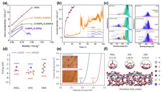 (a) Ionic conductivities of binary xKPF6−yKFSI/EC−DEC electrolytes with different KPF6/KFSI ratios and total molarities; (b) chronoamperograms of Al electrodes in xKPF6−yKFSI/EC−DEC electrolytes at 4.6 V. Reprinted with permission from Ref. [49]. Copyright 2020, American Chemical Society. (c) C 1 s and F 1 s surface XPS profiles of graphite electrodes cycled with 0.8 M KFSI, 0.5 KPF6−0.3 KFSI and 0.7 M KPF6. Reprinted with permission from Ref. [28]. Copyright 2021, Elsevier. (d) LUMO and HOMO of KNO3, KFSI and DME (Atoms in molecular structures: K−purple; N−blue; O−red; S−yellow; F−white; C−brown; H−pale pink); (e) LSV curves of Al electrodes in 2.3 M KFSI/DME electrolytes with/without KNO3 additive ( microscopic images of surface morphology of Al foil electrodes shown in the inset); (f) Comparison of adsorption energy of KNO3, KFSI, and DME molecules by Al2O3 surface. Reprinted with permission from Ref. [50]. Copyright 2021, Elsevier.