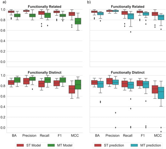 The performance of the ST and MT models was assessed based on five measures, including balanced accuracy (BA) [], precision, recall, F1 score (F1) [] and Matthew’s Correlation Coefficient (MCC) [].