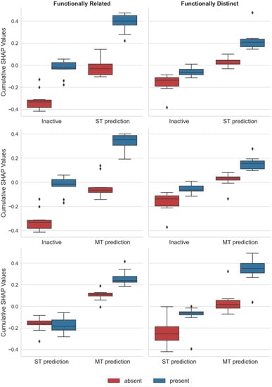 For the prediction of ST- and MT-CPDs with the ST model, very similar feature contribution patterns were detected. For functionally related target pairs (on the left in Figure 2), ST-CPDs were distinguished from random (inactive) compounds based on features that were present in ST-CPDs, making strong positive contributions to prediction probability; however, these were absent in random compounds (making negative contributions). These features largely determined the correct prediction of ST-CPDs. By contrast, features present in random, and absent in ST-CPDs, made very little, if any contributions (with cumulative SHAP values close to zero). Essentially, the same observations were made when MT-CPDs were correctly predicted with ST models. Notably, the magnitude of positive and negative feature contributions was very similar in both cases. A somewhat different picture emerged for predictions with MT models. In this case, correct discrimination between MT- and corresponding ST-CPDs was also mostly driven by features that were present in MT- and absent in ST-CPDs. However, features absent in MT-CPDs also made smaller positive contributions, while features present or absent in ST-CPDs made negative contributions. Hence, prediction outcomes for MT models of related target pairs were determined by more complex feature patterns than for the corresponding ST models (while prediction accuracy was comparably high). For functionally distinct target pairs (on the right in Figure 2), the feature patterns of MT models changed again. Here, features present in MT-, but absent in the corresponding ST-CPDs, dominated correct predictions, very similar to the observations made for predictions with ST models for related target pairs. Again, the same trends were also observed for ST models of distinct target pairs, but the differences between contributions of features that were present or absent in ST- or MT-CPDs and random compounds were smaller.