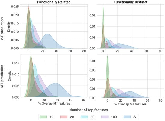 Feature overlap. Density plots show the overlap of feature sets of MT-CPDs, correctly predicted by the MT model, with feature sets of ST-CPDs, correctly predicted by the ST model (top) and MT-CPDs, correctly predicted by the ST model (bottom) for increasing numbers of top-ranked features. Feature overlap was calculated over all independent trials for related or distinct target pairs.