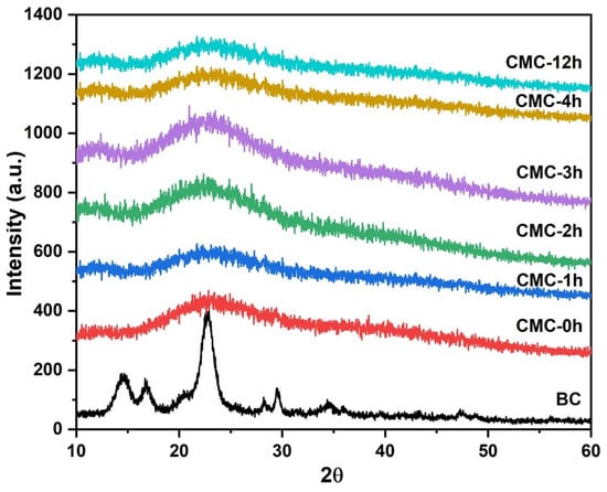 In Figure 1, the XRD pattern of pristine BC and synthesized CMC powders were reported. The crystalline peaks corresponding to cellulose I (2q 14.4 (101), 16.6 (101), and 22.6 (002)) were present in the BC sample [20]. The XRD patterns of CMC samples showed a decrease in crystallinity when the reaction time of BC in NaOH solution increases, caused by the separation of hydrogen bonds in cellulose [21]. The splitting of hydrogen bonds increases the distance between each polymer molecule, which favors the reaction of the monochloroacetic acid molecules into bacterial cellulose. This implies that, before the carboxymethylation reaction, NaOH reaction time affected cellulose structure, decreasing the crystallinity of the CMC.
