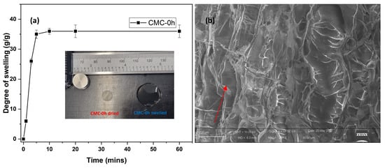 (a) Plot representing degree of swelling of CMC-0 h film at different time intervals (inset: image of CMC-0 h film in dry and swelled state) and (b) SEM image of freeze-dried CMC-0 h hydrogel (Pores are indicated by red arrows).