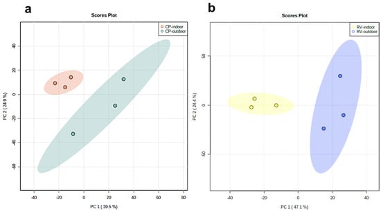 Principal component analysis (PCA) score plots of the extracted metabolic features obtained by untargeted LC-MS analysis in the negative ionization mode (a) CP-indoor (red color) and CP-outdoor (green color) and (b) RV-indoor (yellow color) and RV-outdoor (blue color).