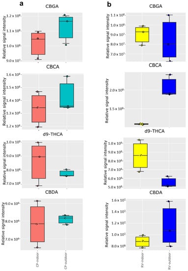 Comparison of the primary, intrinsic cannabinoids, CBGA, CBCA, Δ9-THCA, and CBDA detected by LC-MS analysis in (a) CP-indoor and CP-outdoor; (b) RV-indoor and RV-outdoor (n = 3 independent samples per group).