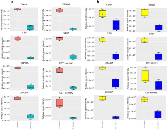 A more detailed analysis of all the extracted signal intensities using volcano plots was performed to visualize independent changes in cannabinoid profile and to discriminate between outdoor and indoor-grown cultivars (Supplementary Figure S2b). The levels of 42 and 32 ion features were remarkably higher (FDR-corrected p-value < 0.05 and fold change threshold of 2) in the indoor-grown CP and RV groups, respectively. Moreover, the relative abundance of 42 ion features was significantly lower in the indoor-grown CP samples (Supplementary Figure S2c). By removing different co-existing adduct ions, in-source fragment ions, and finally matching the MS/MS fragments with available commercial standards or reported in literature, we could annotate 21 unique cannabinoids as shown in Table S1. Intriguingly, we found significant differences in the levels of the cannabinoids between the two cultivation methods that produced through the environment the cannabis is subject to during growth, curing, and packaging, as shown in Figure 3. For both cultivars, the oxidation and degradation products of the primary cannabinoids, including CBN, CBNA, OH-CBNA, CBNBA, CBNDA, CBEA, CBT-isomer 1, and CBT-isomer 2, and others, are significantly amplified in the indoor-grown samples. CBNDA and CBEA are the results of full aromatization and photo-oxidation of CBDA, respectively. CBT isomers are the hydroxylated forms of THC [41]. CBN and its derivatives and analogs are synthesized from the oxidative aromatization of their corresponding THC-type derivatives [34]. The continued exposure of CBN to ultraviolet light in the presence of oxygen or air produces degradation products, OH-CBN. Interestingly, we found over two orders of magnitude more CBNA compared to CBN in these samples (Figure 3), indicating that CBNA produced from THCA and consequently, CBNA becomes CBN through spontaneous or induced decarboxylation.