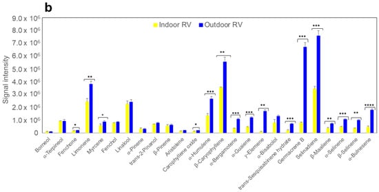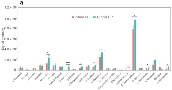 Identified terpenes from targeted GC-MS analysis in (a) CP-indoor and CP-outdoor, (b) RV-indoor and RV-outdoor. Data are plotted as the average ± SD, n = 3 individual samples; **** p < 0.0001, *** p < 0.001, ** p < 0.01, * p < 0.05 as calculated by t-test.