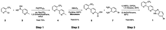 In the original method, target compound 1 was synthesized only up to the 10 g scale in three steps. This synthesis began with preparation of 6′-methyl-3-(trifluoromethyl)-2,3′-bipyridine 4 via the Suzuki–Miyaura reaction of 2-chloro-3-(trifluoromethyl)pyridine 2 with (6-methylpyridin-3-yl)boronic acid 3. Compound 3 was prepared from 5-bromo-2-methylpyridine using a previous method [14,15]. The subsequent oxidation of the methyl group of intermediate 4 using potassium permanganate in a microwave reactor led to carboxylic acid 5. To complete the synthesis, compound 5 was converted to the desired compound 1 by a two-step reaction including amine-carboxylic acid coupling with compound 7 followed by cyclization (Scheme 1) [13].