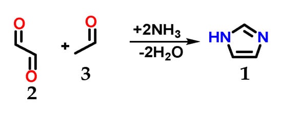 Scheme of the synthesis of imidazole 1 using glyoxal 2 and formaldehyde 3 in ammonia.
