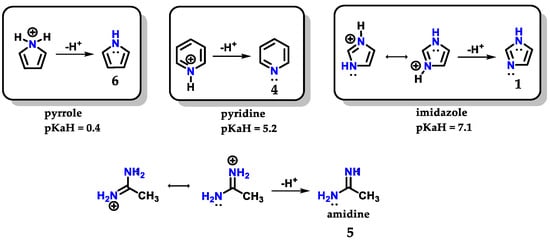 Imidazole 1 can form stable crystalline salts with strong acids through the protonation of the sp2 nitrogen (N-3), known as imidazolium salts. Imidazole 1 has a pKaH of 7.1 (Figure 4), acting as a strong base [8]. The basicity of imidazole is above that of pyridine 4 (pKaH of 5.2) due to the amidine-like 5 resonance, which allows both nitrogens to participate equally in charge accommodation [7,8,9]. Comparatively, the basicity of imidazole 1 contrasts with the basicity of pyrrole 6 (pKaH of 0.4), which is an extremely weak base, because when pyrrole 6 is protonated, there is a loss of aromaticity which is built with the participation of the nonbonding electron pair of N-1 nitrogen [7].