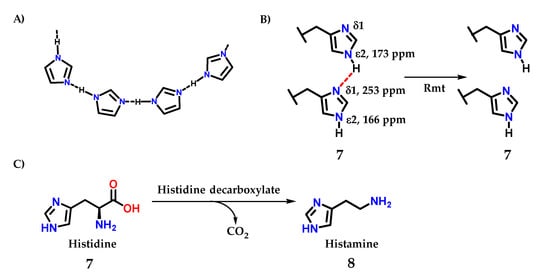 (A) Intermolecular interactions through the hydrogen interactions that imidazole-containing derivatives can perform. (B) Intermolecular interactions through the hydrogen interactions in histidine residues. (C) Structure of histidine 7, precursor of histamine 8 biosynthesis.