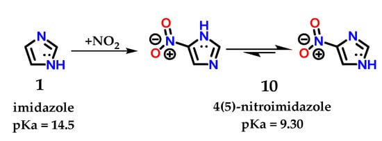 Representation of imidazole 1 and tautomeric forms of 4(5)-nitroimidazole 10, with their respective pKa values.
