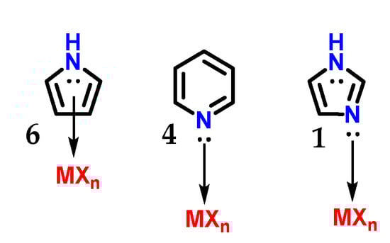 Although imidazole 1 and pyrrole 6 are π-excessive heterocycles (π donors), imidazoles do not establish η5(π)-complexes (η being the chemical hardness) with transition metals. Imidazole 1 behaves as a π-deficient ligand (π-acceptor) similar to pyridine 4, and its sp2 nitrogen atoms mainly form η1(σ,Npy) complexes (Figure 9), as does pyridine 4 [7].