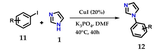 One-pot reactions using iodobenzene 11 and imidazole 1 in the presence of K3PO4 as the base, CuI as the catalyst and DMF as the solvent at 35–40 °C for 40 h, give the corresponding N-arylimidazoles 12 in quantitative yields (Figure 10) [21].