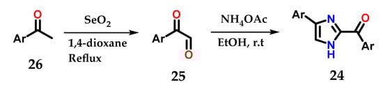Another synthetic strategy used to construct disubstituted imidazole derivatives 27 from methyl ketones 28 consisted of exploiting its metal-free acid-catalyzed oxidation and coupling with aldehydes 29 and 30 in the presence of ammonium acetate (Figure 14) [25].