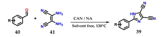 2-Aryl-4,5-dicarbonitrile imidazole derivatives 39 could be obtained from the coupling of substituted aromatic aldehydes 40 and 2,3-diaminomaleonitriles 41 in the presence of a mixture of cerium (IV) ammonium nitrate/nitric acid (CAN: NA|0.05: 0.4 eq.) at 120 °C for less than 1 h without using solvents (Figure 18) [30].