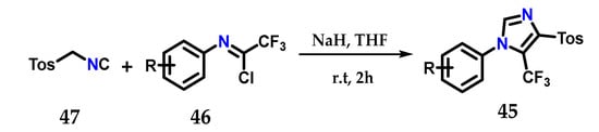Using the Van Leusen method, it was possible to synthesize 1,4,5-trisubstituted imidazoles containing a trifluoromethyl group 45, exploiting the coupling of N-aryltrifluoroacetimidoyl chloride 46 and tosyl-methylisocyanate (TosMIC) 47 using sodium hydride as a base in dry THF at room temperature (Figure 20) [32].
