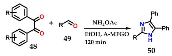 Obtaining 2,4,5-trisubstituted imidazoles 50 from the coupling of substituted 1,2-diphenylethane-1,2-dione (benzyl) 48, substituted aldehydes 49 and NH4OAc using A-MFGO as a catalyst.