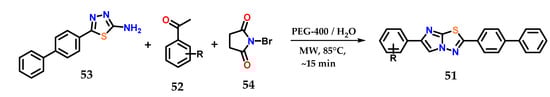 More complex heterocycles presenting the imidazole ring in their structure are described in the literature, such as benzo[d]imidazo[2,1-b]thiazoles 51, which could be synthesized by the condensation of aromatic ketones 52 and 5-(biphenyl-4-yl)-1,3,4-thiadiazol-2-amine 53 in the presence of N-bromosuccinimide 54, PEG-400 and water as solvent under microwave irradiation at 85 °C in quantitative yields after a few minutes of reaction (Figure 22) [41].