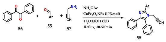 Using various aldehydes 55, benzyl 56, ammonium acetate and prop-2-ynylamine 57 in the presence of CuFe2O4NPs as a catalyst in H2O:EtOH under reflux for approximately 50 min, it was possible to obtain several tetrasubstituted imidazole derivatives 58 in a multicomponent synthesis. It was possible to reuse the catalyst for six reactions without losing its efficiency (Figure 23) [42].