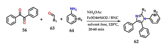 Tetrasubstituted imidazoles 62 were obtained through the condensation of benzyl 56, aldehydes 63 and anilines 64 in the presence of ammonium acetate using Fe3O4@SiO2/BNC as a catalyst.