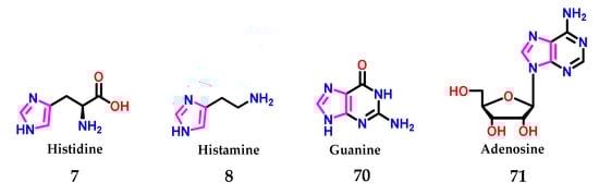As already mentioned, imidazole 1, in biological systems, is found in the form of the amino acid histidine 7, presenting an important role in the catalysis promoted by enzymatic systems [8]. Furthermore, the neurotransmitter histamine 8 induces immunological processes [8,16,49,50,51] and composes the structures of the guanine 70 and adenosine 71 bases of nucleic acids (Figure 27) [52].