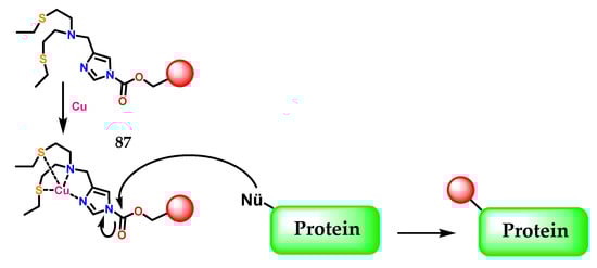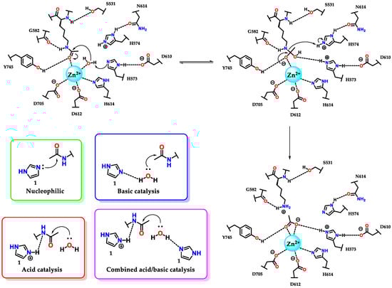 The imidazole 1 group in biological systems generally acts in acid–base and nucleophilic catalysis (Figure 28). As an acid catalyst, protonated imidazole 1 acts as an acid facilitating the exit of the RO- group through hydrogen transfer [56]. In the neutral form, imidazole 1 can act as a nucleophilic catalyst by attacking the electrophilic center, leading to a phosphorylated or acylated intermediate, which is consecutively hydrolyzed, regenerating the imidazole 1 group [57]. Therefore, imidazole 1 catalyzes the cleavage of the X-O bond (for X = C or P). Finally, imidazole 1 can also act as a basic catalyst, assisting the attack of a nucleophile (Nü-H) on the electrophilic center of a substrate, abstracting a proton and thus increasing its nucleophilicity [58,59,60,61].
