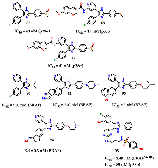 - Takle, A.K.; Brown, M.J.B.; Davies, S.; Dean, D.K.; Francis, G.; Gaiba, A.; Hird, A.W.; King, F.D.; Lovell, P.J.; Naylor, A. The Identification of Potent and Selective Imidazole–Based Inhibitors of B–Raf Kinase. Bioorg. Med. Chem. Lett. 2006, 16, 378–381. [Google Scholar] [CrossRef]